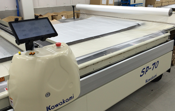 本社工場ではカワカミ製、ミャンマー工場では島精機製の自動裁断機(CAM)をそれぞれ導入しています。裁断は多くの手間と人員が必要で、また切ってしまったら取り返しがつかない性格のものであり、自動裁断機の導入で格段に生産性が向上し、またミスも大幅に減少しました。
