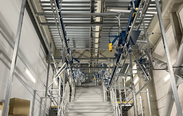 南倉庫では、ピッキングした商品を効率的に出荷場に集約できるよう、マテハン(自動運搬)システムを導入しています。