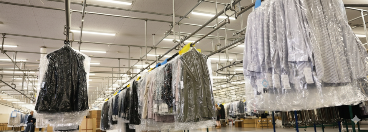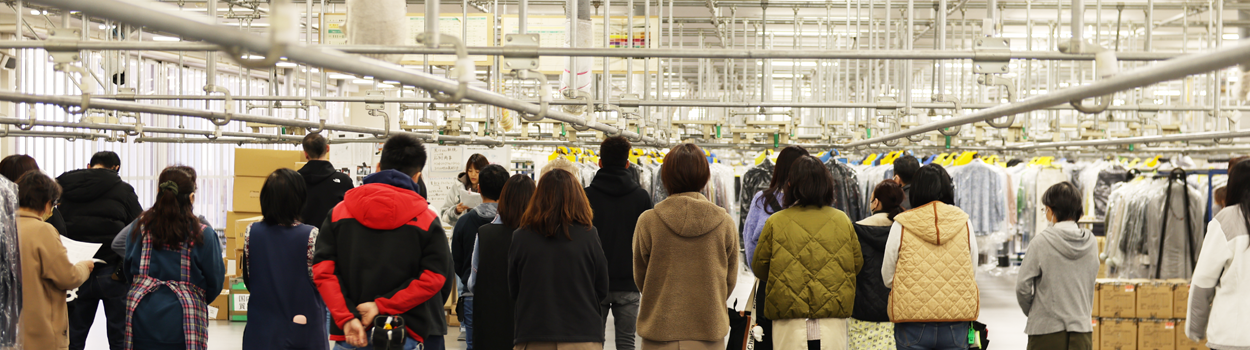 本社には、本社機能のほか、常時〇万着をストックできる倉庫を有しています。また、大型トラックが入れる広大なプラットホームを有し、各倉庫から移動した商品はほぼ本社倉庫から出荷されます。